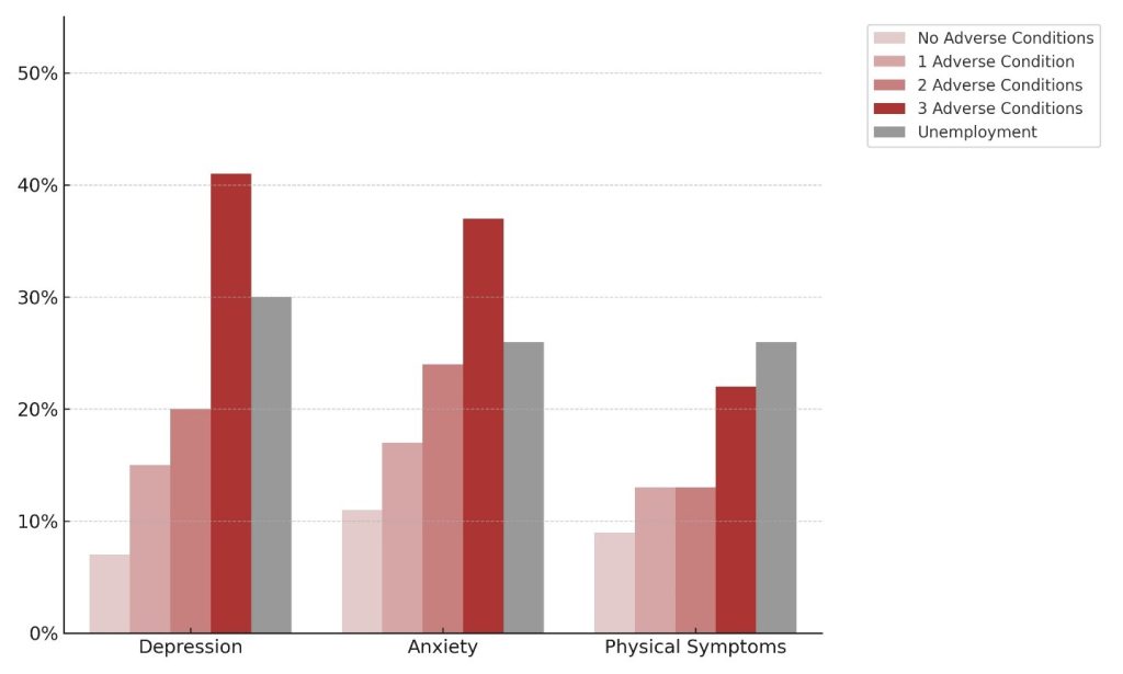 Research is clear: more stressors, poorer mental and psychical health. This is not surprising. The key finding is that individuals facing all three stressors fare no better than the unemployed. What is more, those who transition from unemployment to an insecure, low-quality job typically report worsened, not improved, mental health. This suggests that employment sometimes results in worse outcomes than unemployment.