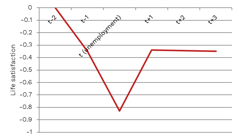 Research data on life satisfaction before, during, and after unemployment shows a clear picture: people are profoundly scarred by the experience of unemployment. The immediate impact of unemployment on life satisfaction is severe. However, although individuals do recover and their life satisfaction does improve over the next few years, they never fully bounce back. In fact, long-term studies demonstrate that the negative effects of the unemployment experience can endure for more than 20 years.